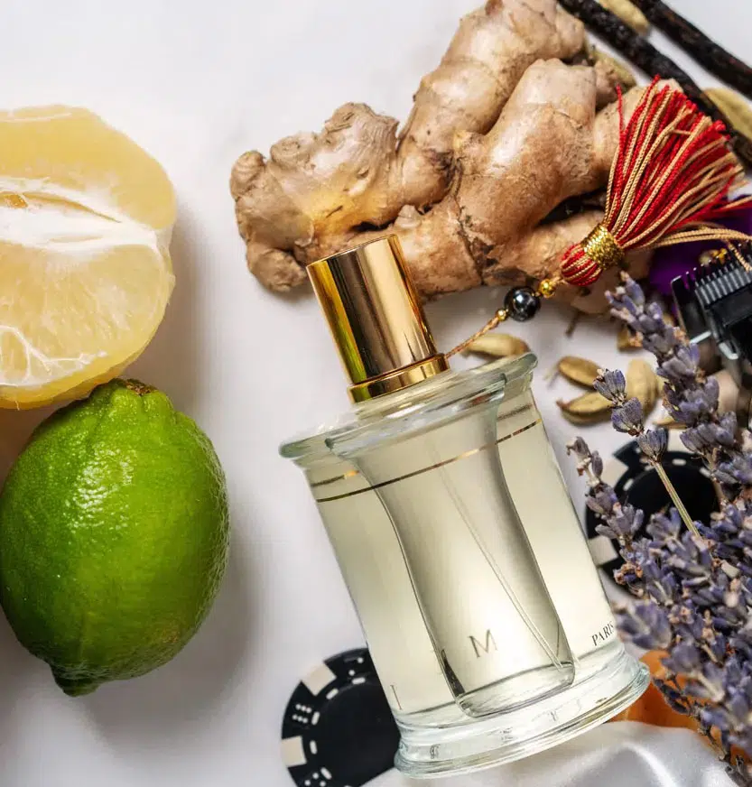Notas de corazón: Hojas de tomillo blanco, granos de cardamomo, lavanda, gengibre