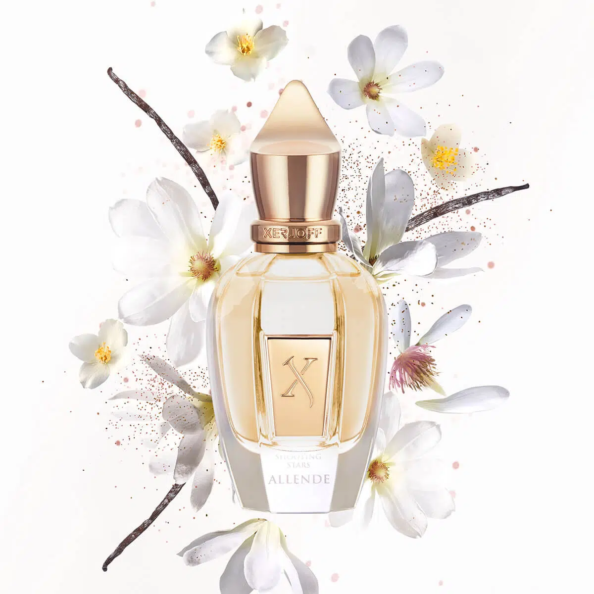 En Allende de Xerjoff, las notas de cabeza de vainilla de Madagascar y magnolia cobran vida en la piel al primer toque, conduciendo suavemente la nariz a un corazón de cacao y vainilla.
