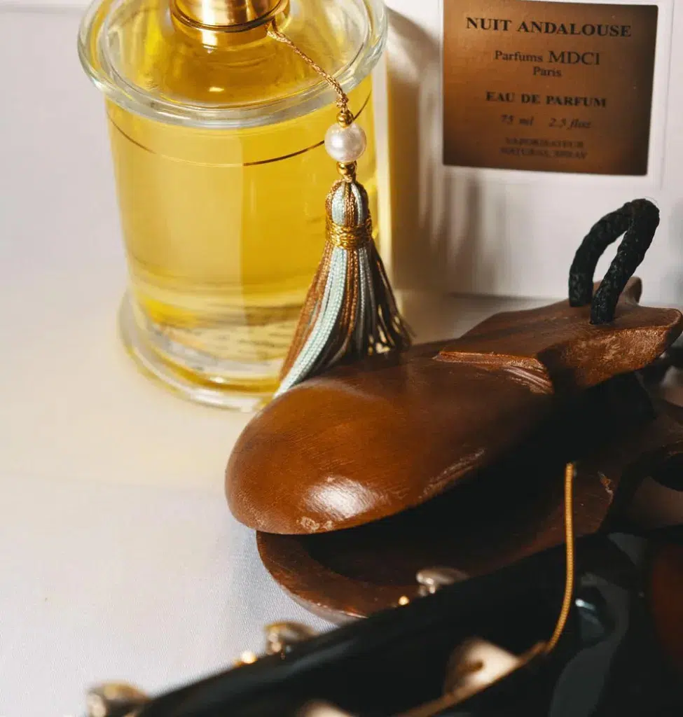 Una encantadora composición en torno al tema de la gardenia que nos transporta al corazón de una cálida noche de verano mediterráneo, lánguida, con el susurro susurrante de las fuentes frescas y de voces y cantos lejanos que se escuchan en el esplendor de los jardines.