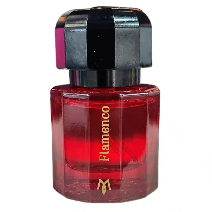 “Flamenco” es mi manifiesto olfativo, mi origen, mi herencia…es alma de España, seña de identidad, símbolo cultural y esencia del sur. Emoción embriagadora interpretada en cante, guitarra y baile, sentimiento que imagino presente bajo el embrujo magnético de una noche en la Alhambra. Impregnado de este sentimiento, mi reto para acercarme al arte, es hacerlo trascender en perfume: Como un abanico, de amplio lenguaje y ondulante ritual, arranca y muestra su fortaleza entrelazando maderas de cedro del atlas y pino mediterráneo. Como una flor, despliega en sus pétalos, el júbilo del azahar en Sevilla, la pasión de la rosa roja en Damasco y la sensualidad irresistible del jazmín bajo la luna. Como un toque de guitarra, vuela al aire, entre lunares de frambuesa y faralaes de azafrán. Y como en un éxtasis final, encuentra el duende en una combinación de néctar de ámbar, voluptuoso iris y almizcle narcótico.